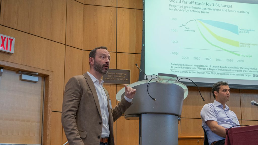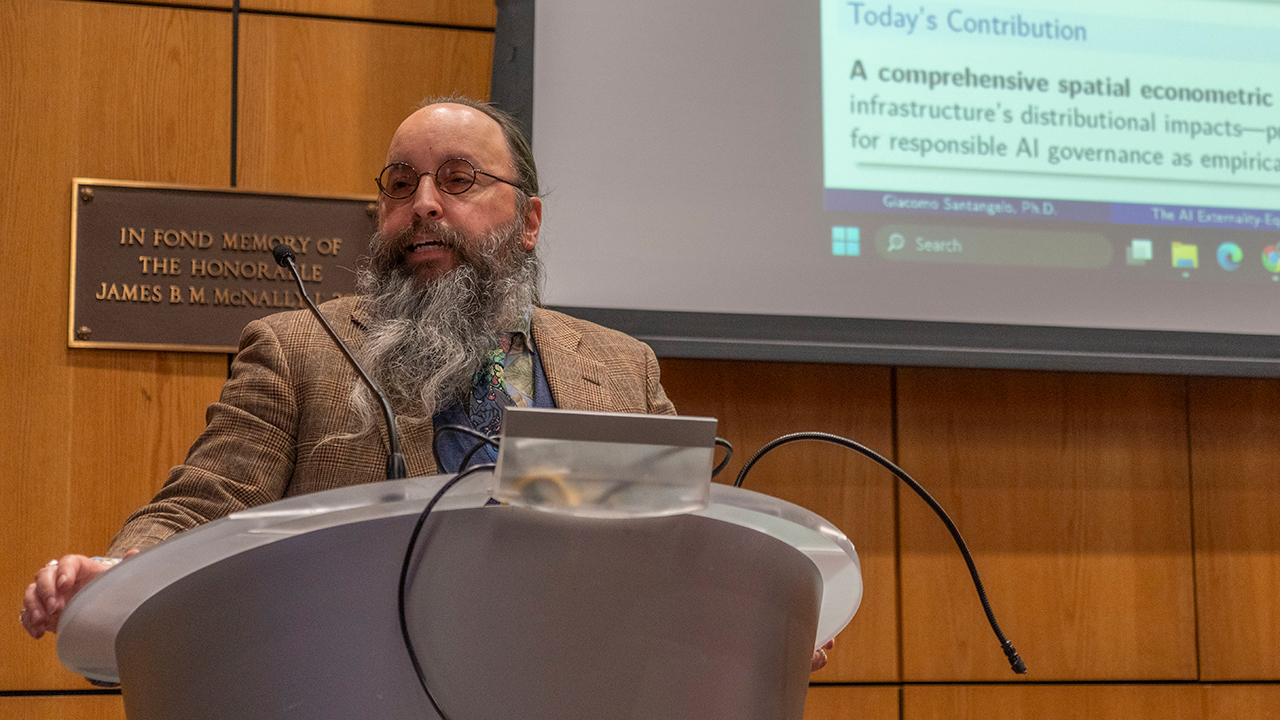 Another presenter, Fordham economics lecturer Giacomo Santangelo, Ph.D., noted that the infrastructure for new technologies tends to be built in lower-income areas—in the case of data centers, bringing environmental harms such as heat island effects and degraded air and water quality. “The environmental costs are socialized to local communities, while benefits are privatized somewhere else,” he said.
